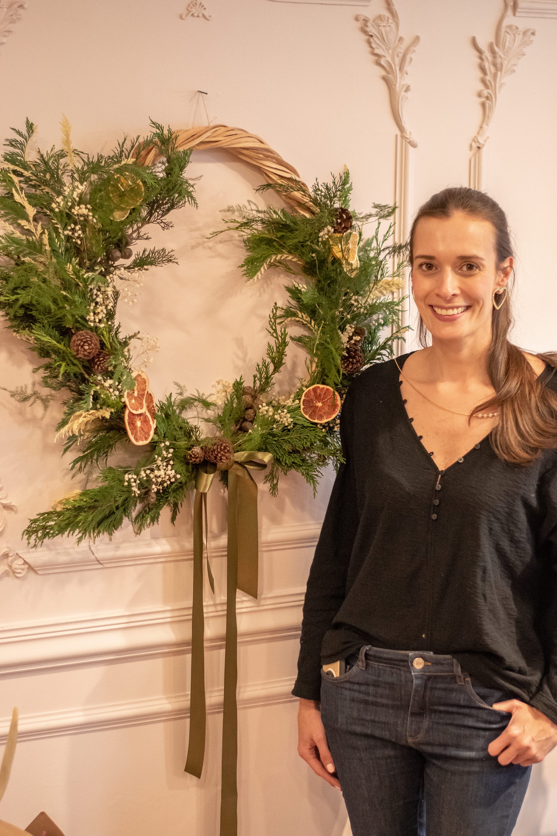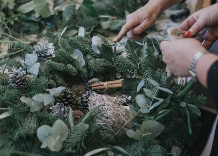paso a paso, iremos dando forma a la corona con pino fresco, explorando texturas y movimiento.