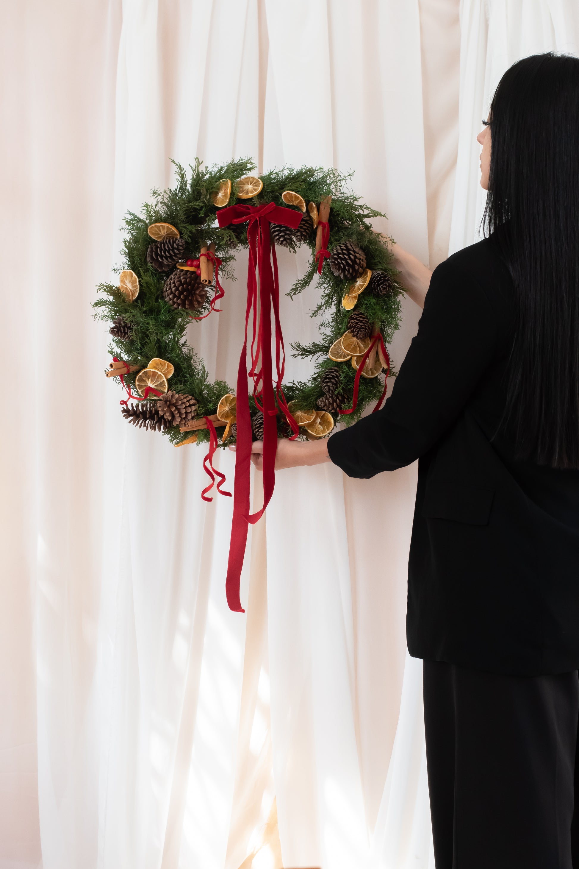 Armónica y navideña corona decorativa diseñada con pino y decorada con ornamentos de navidad.
