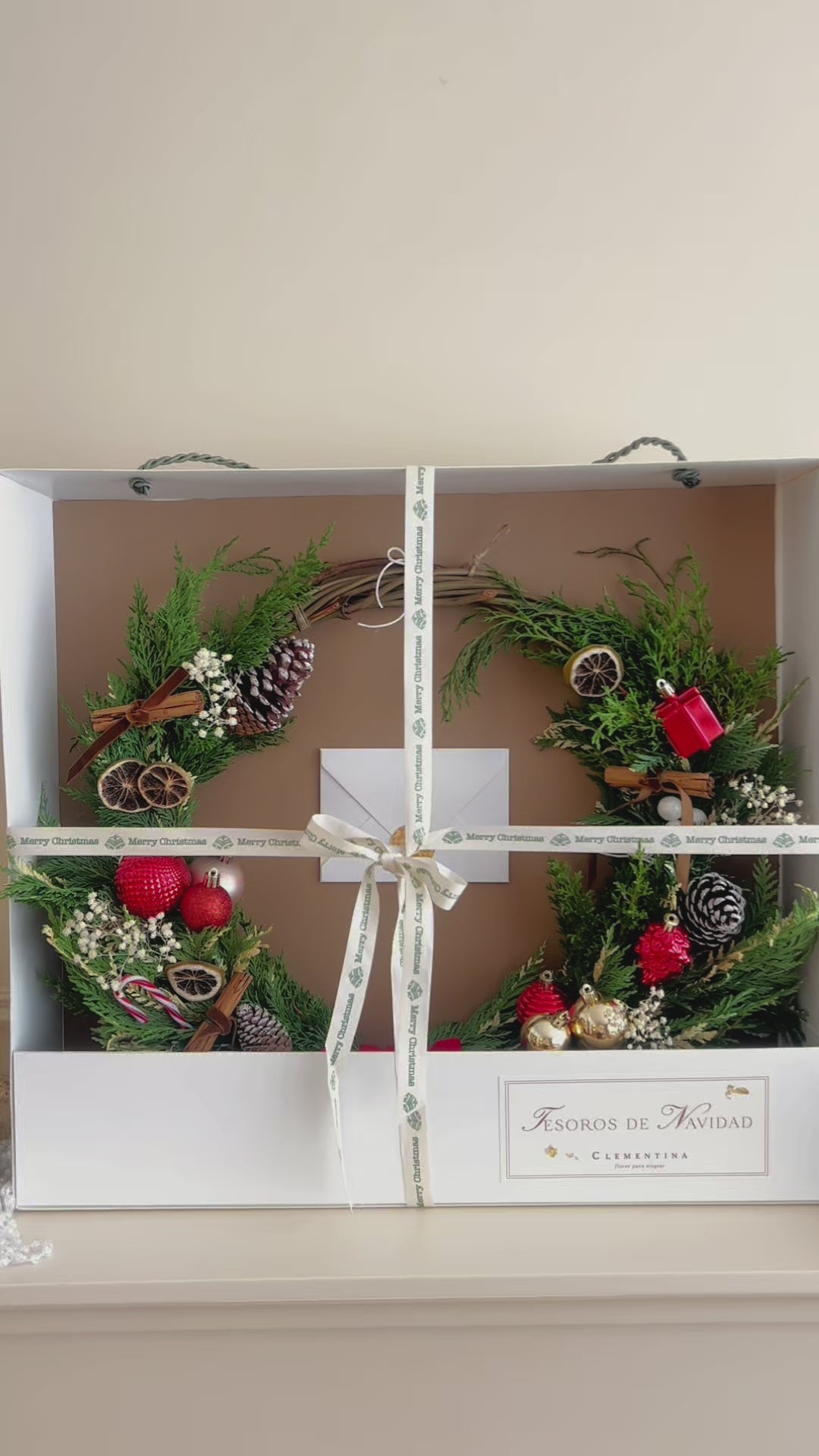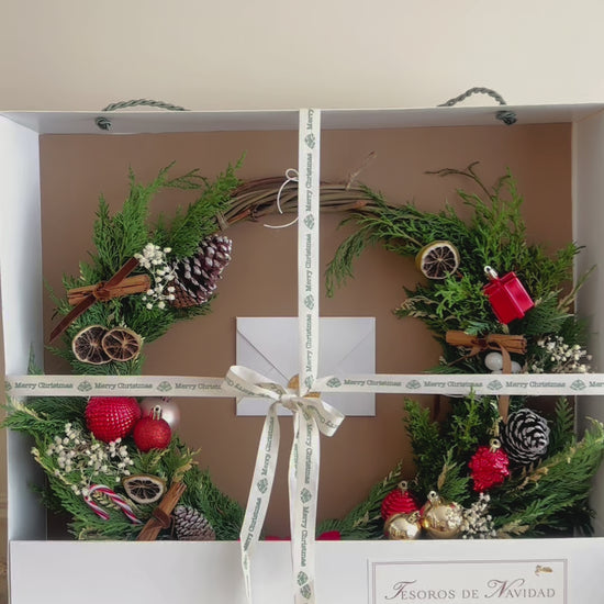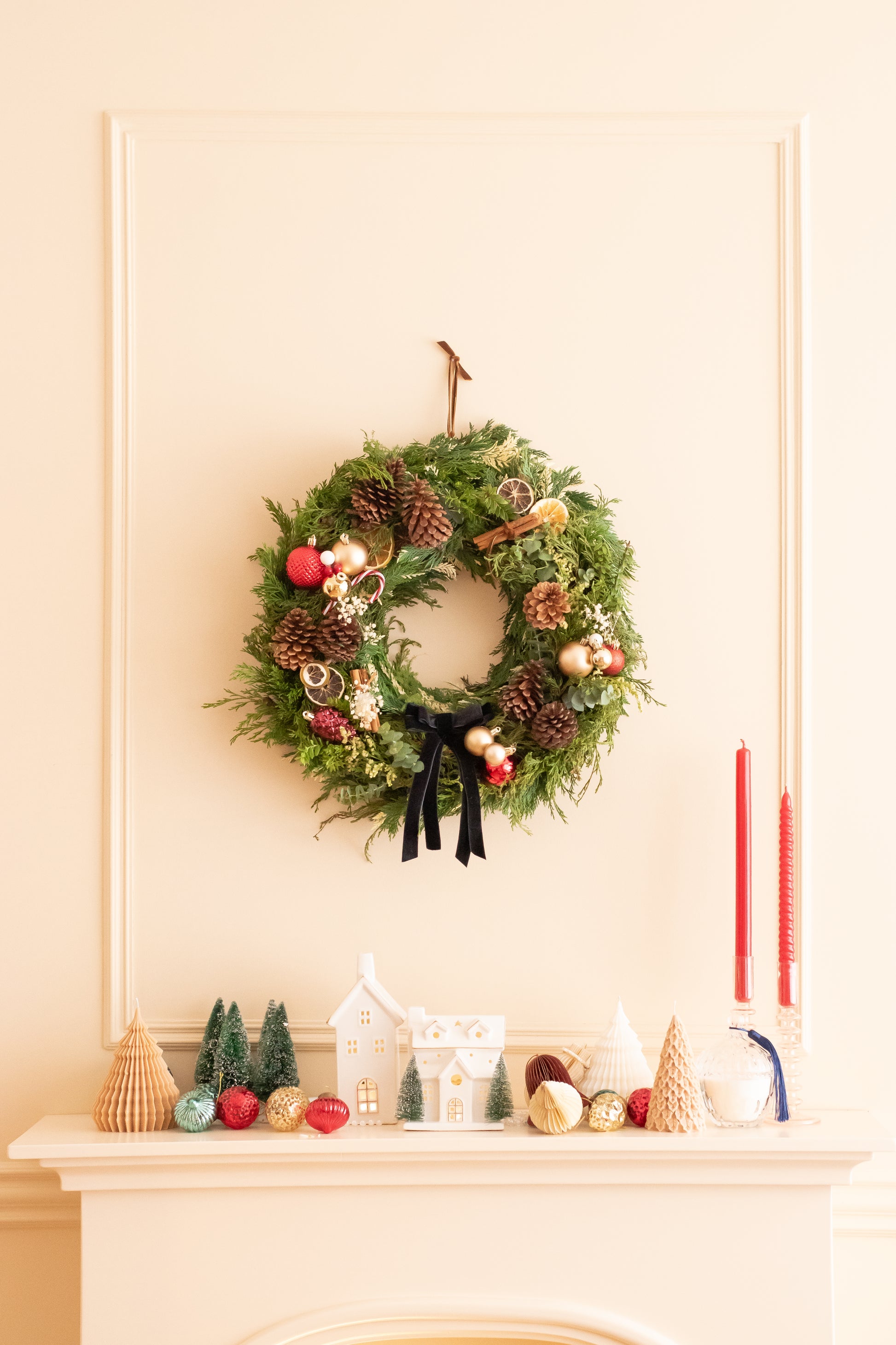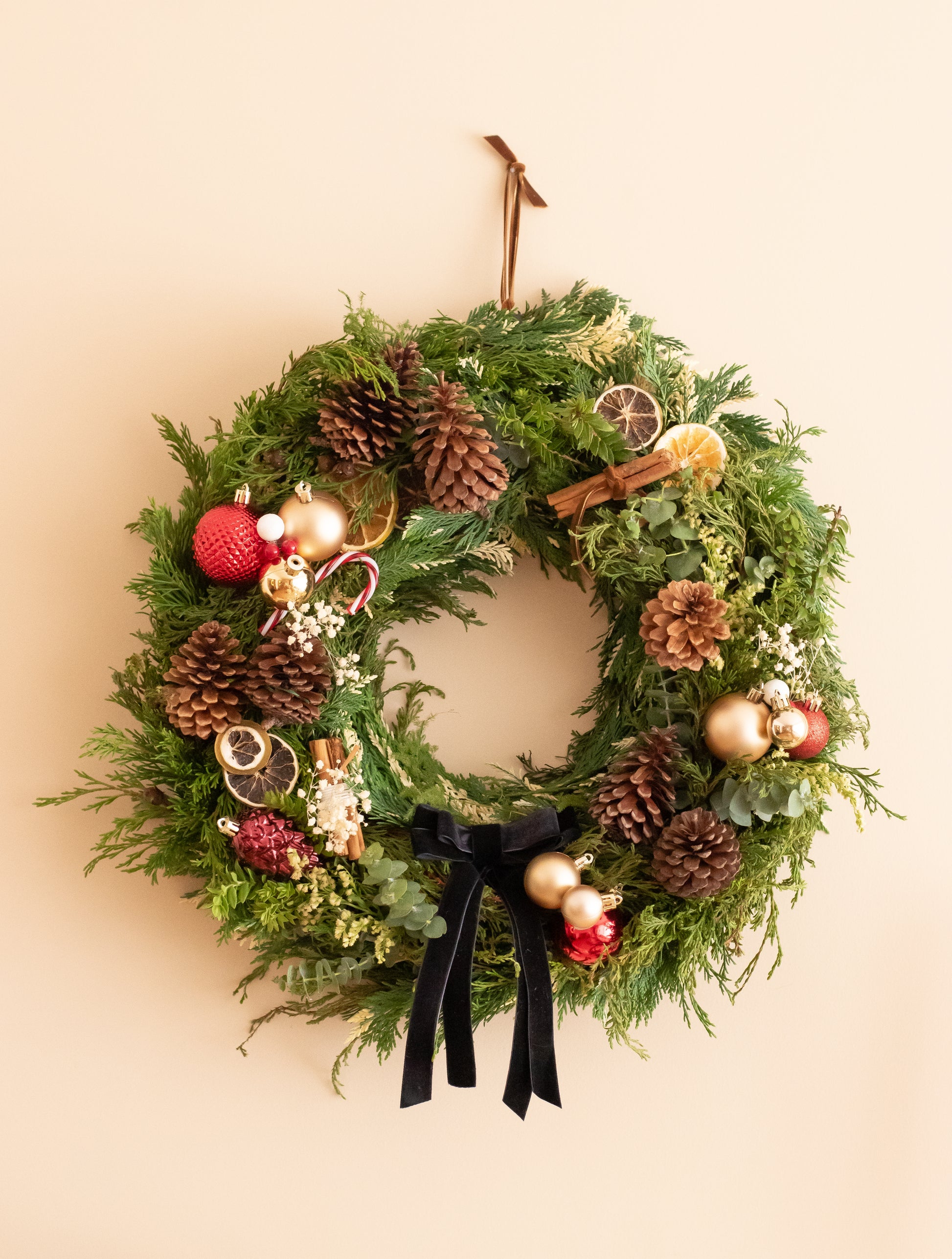 Armónica y navideña corona decorativa diseñada con pino y decorada con ornamentos de navidad.