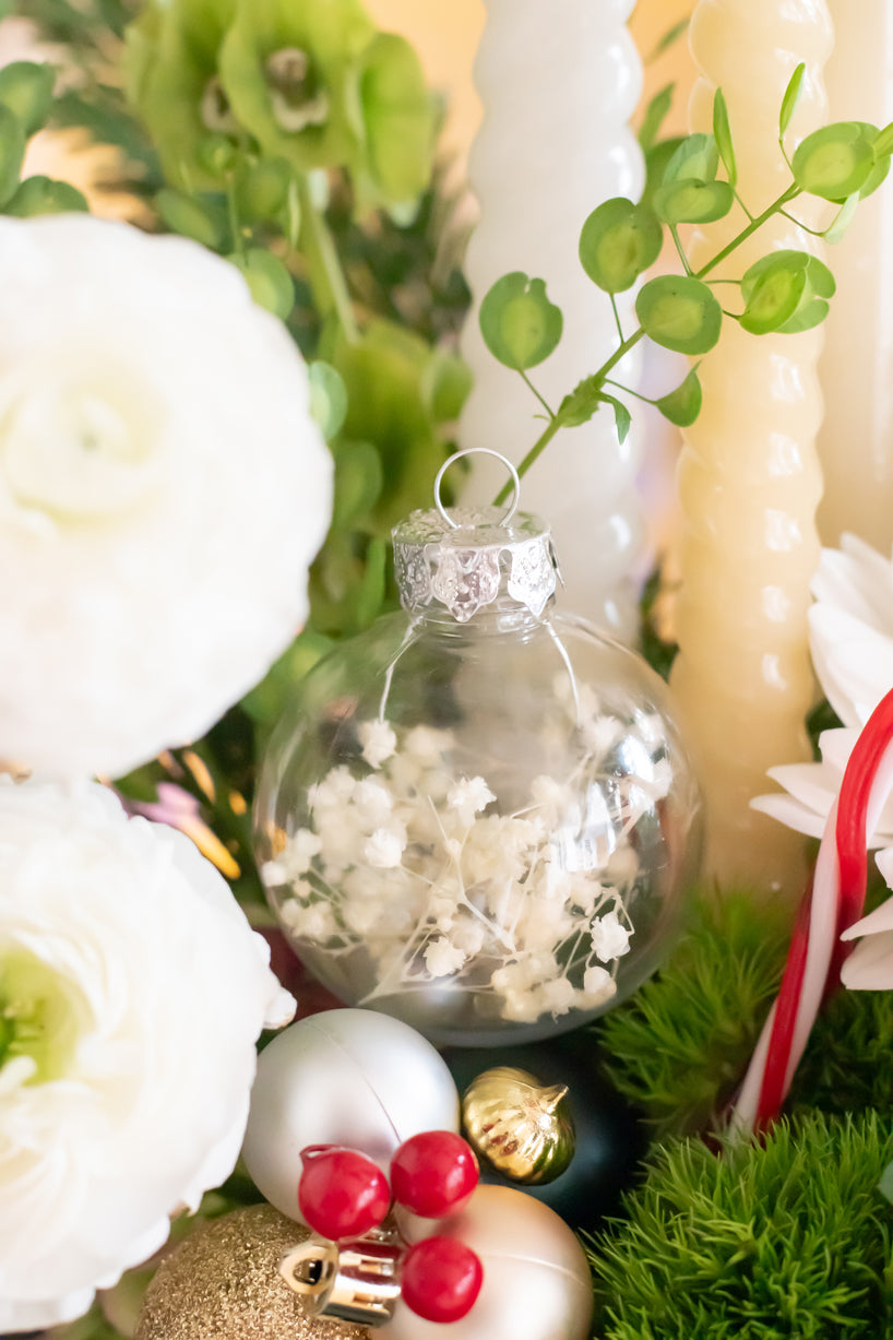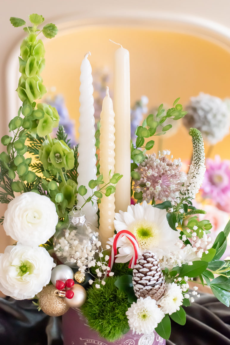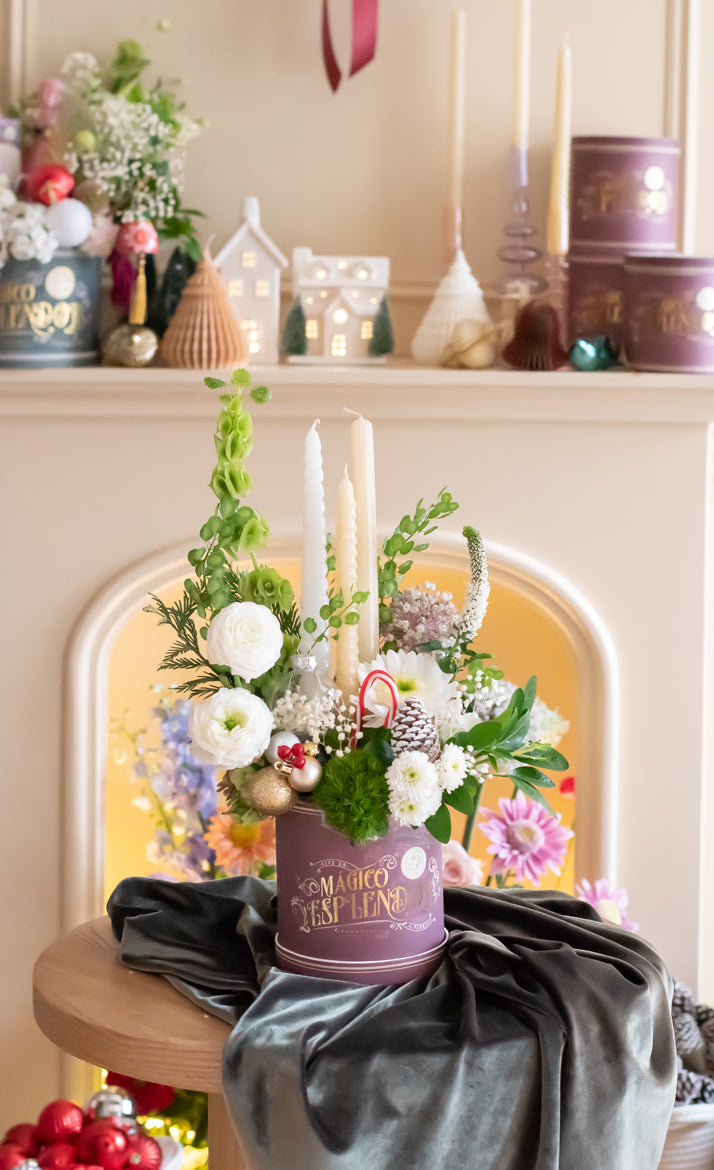Mezcla de flores entre follaje del bosque encantado, acompañada de velas y ornamentos navideños.